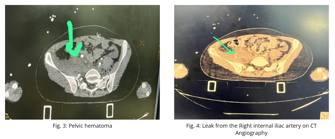 A bedside ultrasound (eFAST) showed free fluid in the abdomen, indicating internal bleeding. Once her blood pressure improved slightly with blood transfusion, she was taken for a full-body CT scan, including CT Angiography of the abdomen and pelvis. Imaging revealed liver and kidney lacerations, pelvic and sacral fractures, and active bleeding from the right internal iliac artery. She was immediately shifted to the cath lab, where the interventional radiology team performed embolization to stop the bleeding.